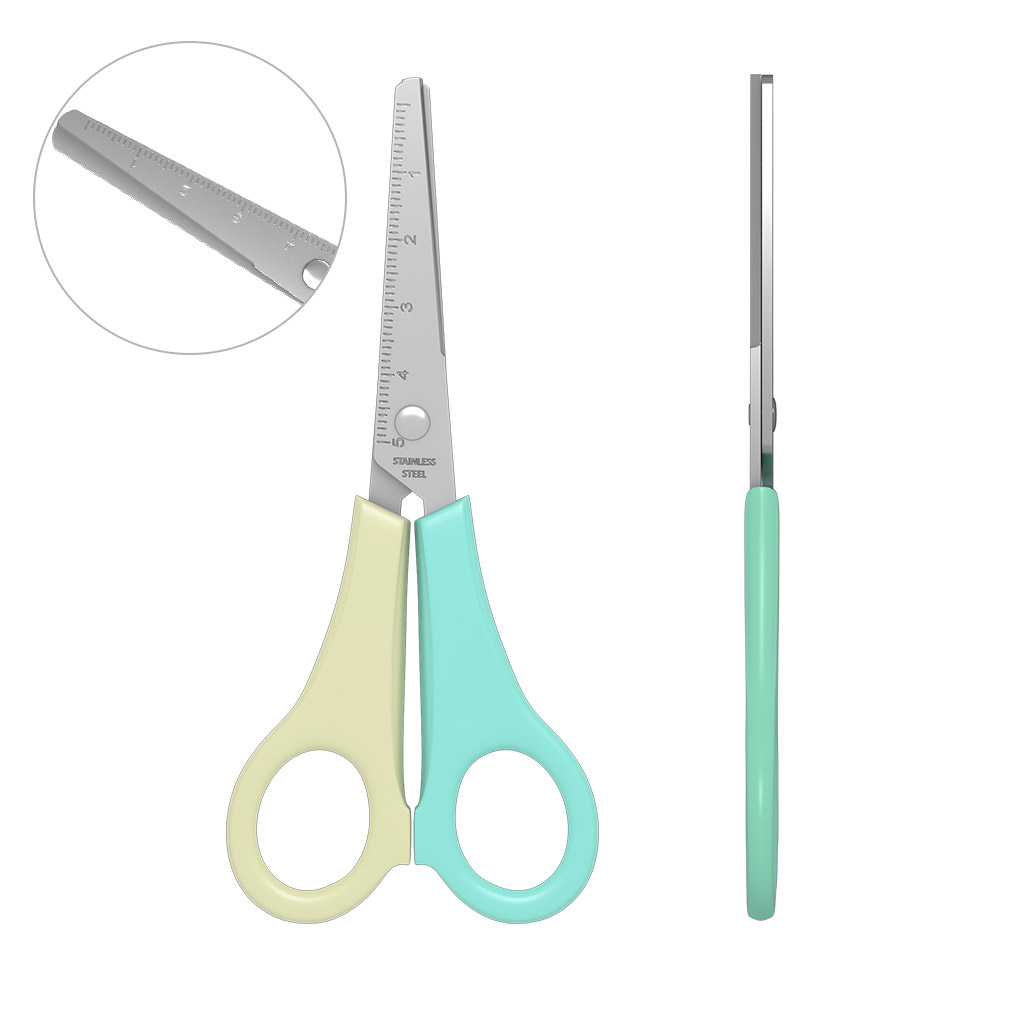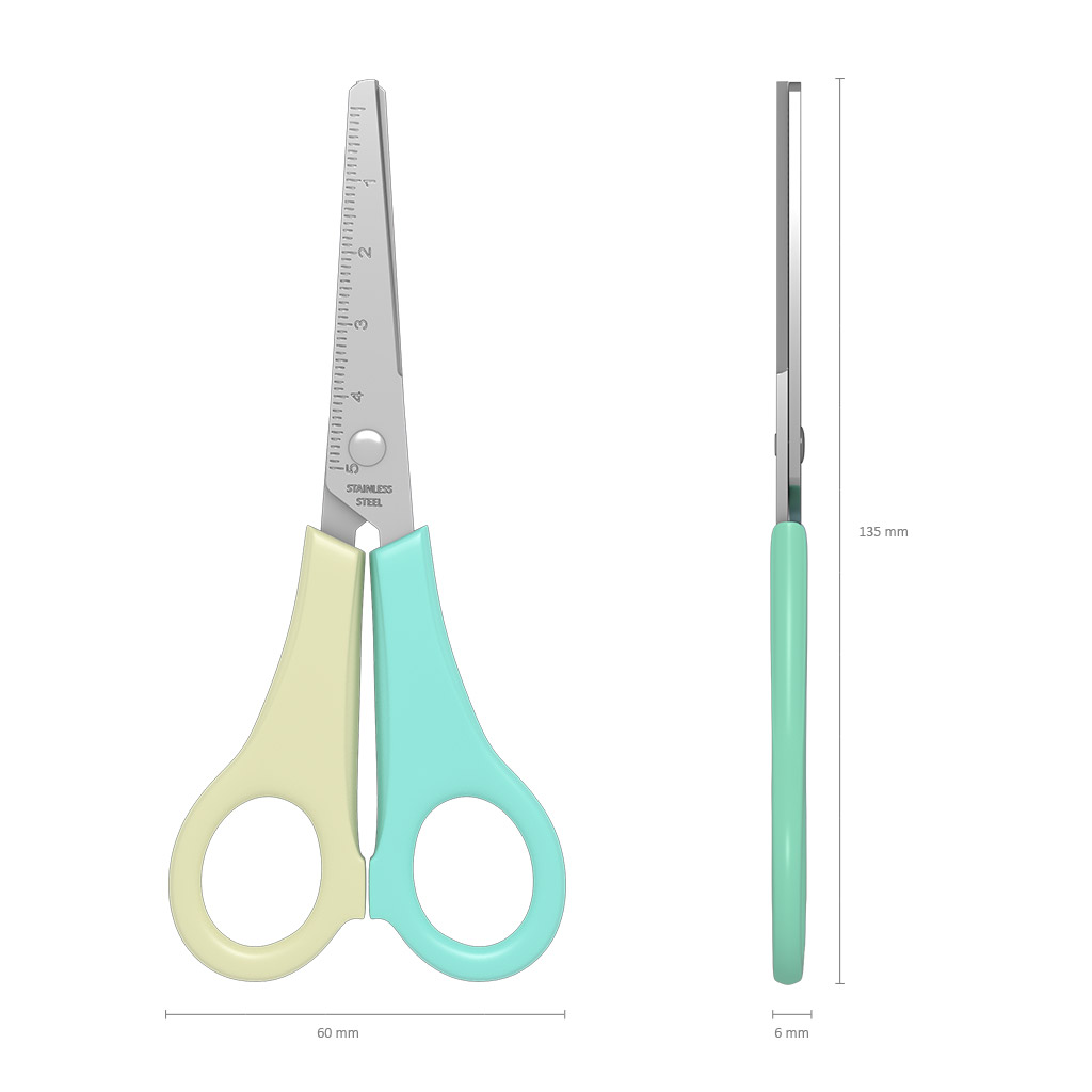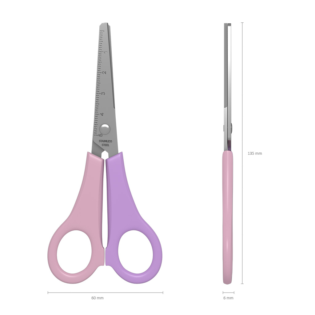Ножницы с лезвиями из высококачественной нержавеющей стали с безопасными закругленными концами лезвий и линейкой, обеспечивающей точность резки. Не ржавеют. Ручки классической формы изготовлены из ударопрочного пластика. Товар поставляется в нескольких вариантах цвета/дизайна без возможности выбора. |