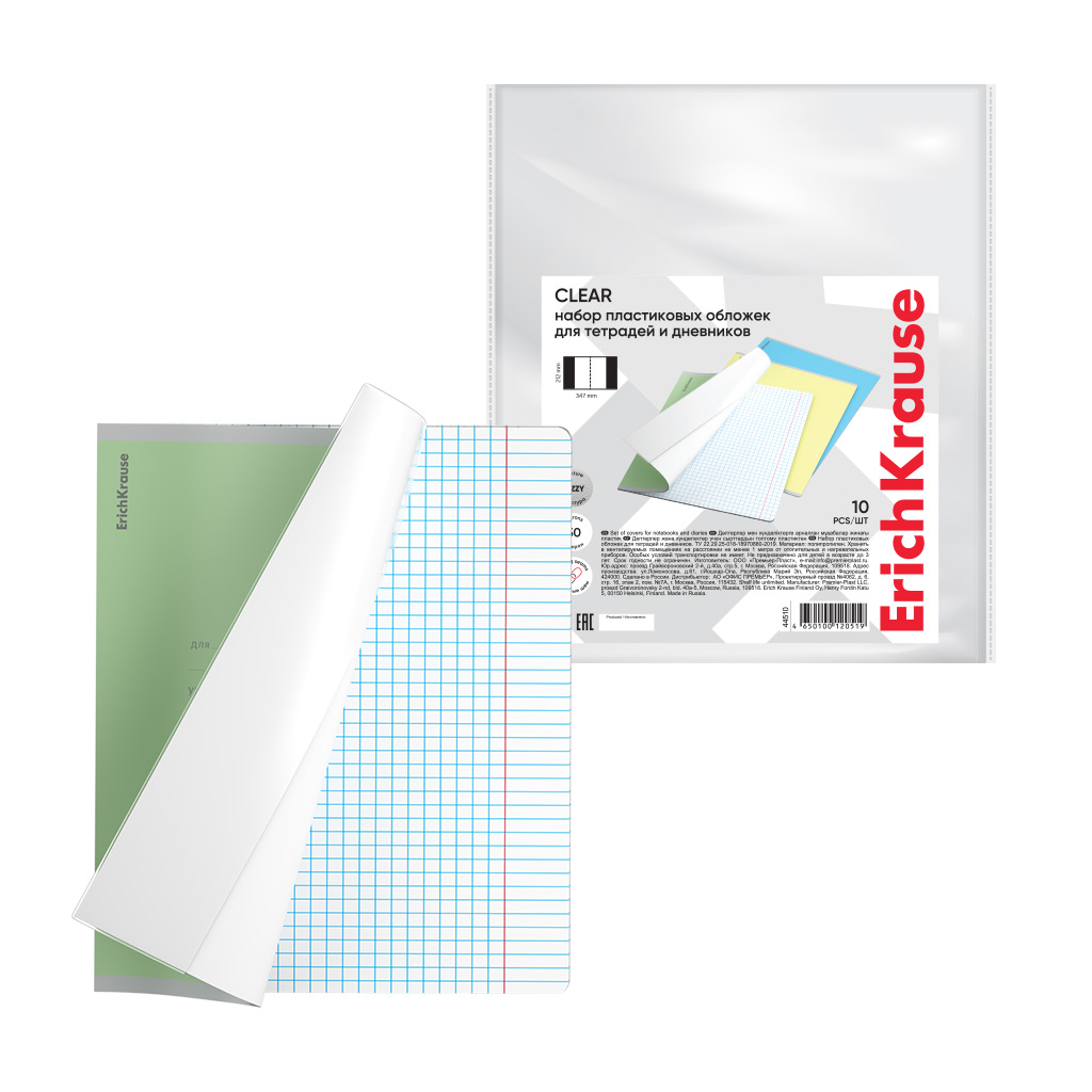 Набор пластиковых обложек ErichKrause Fizzy Clear, для тетрадей и дневников, 212х347мм, 80 мкм (пакет 10 шт.) |
