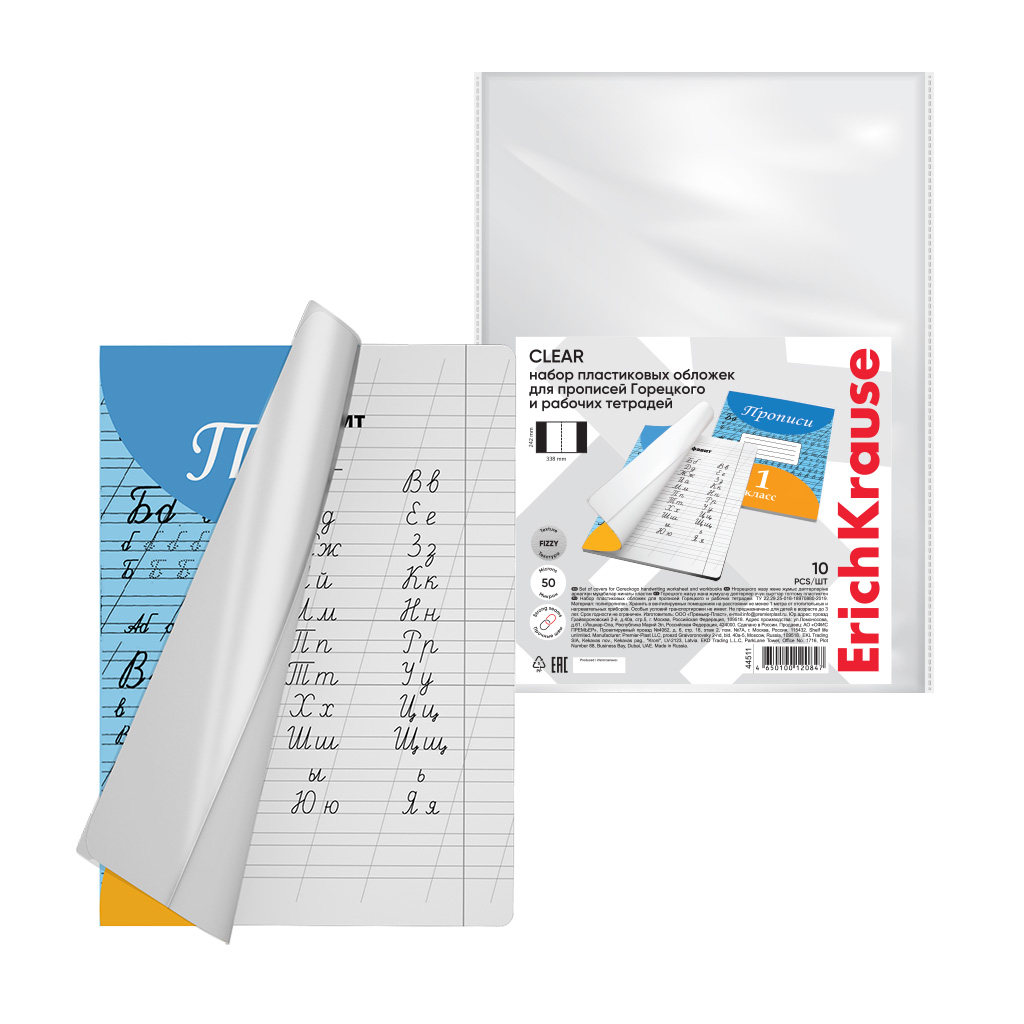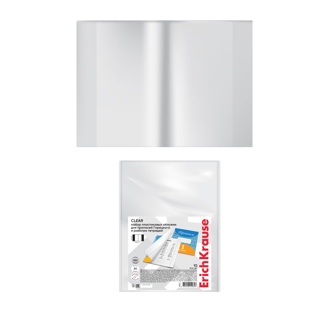 Набор пластиковых обложек ErichKrause Fizzy Clear, для прописей Горецкого и рабочих тетрадей, 242х338мм, 50 мкм (пакет 10 шт.)