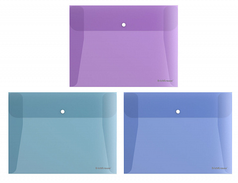 Папка-конверт на кнопке пластиковая ErichKrause® Vivid, с 3 клапанами, A4, ассорти (в пакете по 3 шт.) |