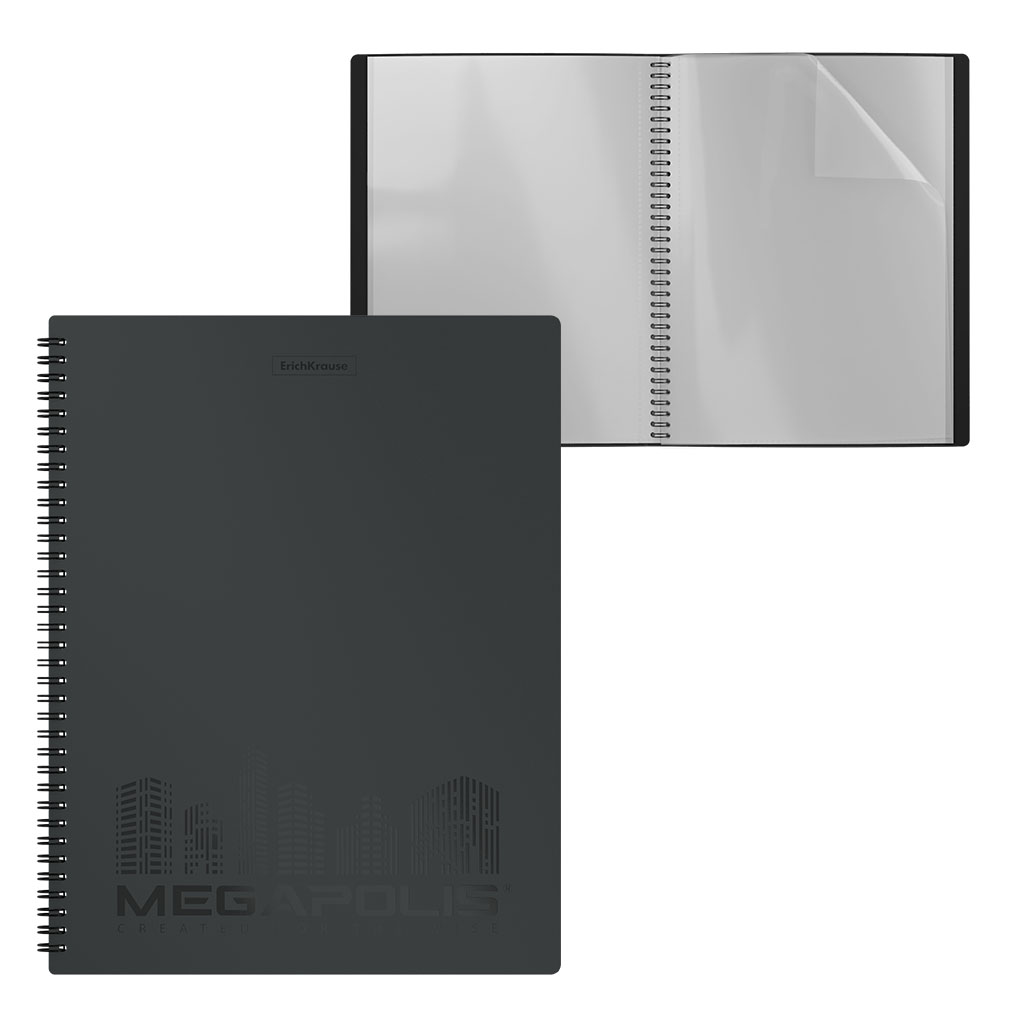 Папка файловая пластиковая ErichKrause® MEGAPOLIS, c 60 прозр. карманами на спирали, A4, черный (в коробке-дисплее по 6 шт.) |