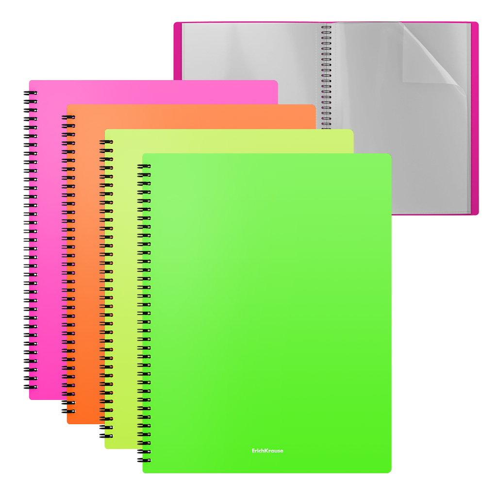 Папка файловая пластиковая на спирали ErichKrause Matt Neon, с 40 прозрачными карманами, A4, ассорти (в пакете по 4 шт.)