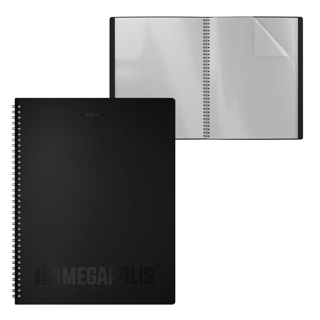 Папка файловая пластиковая на спирали ErichKrause MEGAPOLIS, c 20 карманами, A4, черный (в пакете по 4 шт.) |