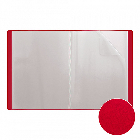 Папка файловая формата А4 из высококачественного пластика с текстурой поверхности "песок", на которой не видно отпечатков пальцев и мелких царапин. Предназначена для хранения и просмотра документов. Папка содержит 30 прозрачных листов-карманов, надежно скрепленных сваркой. Карман на корешке папки предназначен для информационной карточки. Цвет папки – красный. Папка вмещает до 100 бумажных листов. Размер - 231х310х17мм, толщина - 0.6мм. |