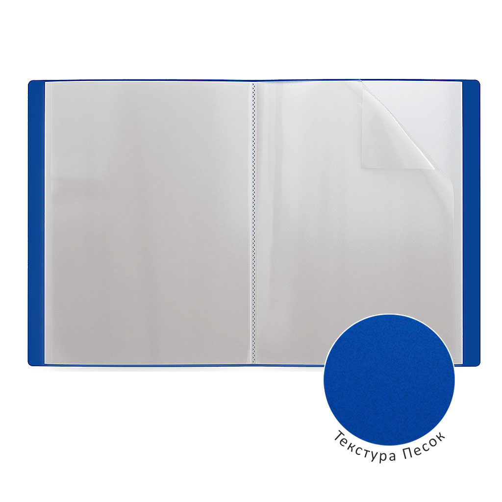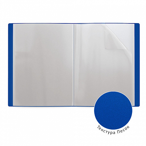 Папка файловая формата А4 из высококачественного пластика с текстурой поверхности "песок", на которой не видно отпечатков пальцев и мелких царапин. Предназначена для хранения и просмотра документов. Папка содержит 30 прозрачных листов-карманов, надежно скрепленных сваркой. Карман на корешке папки предназначен для информационной карточки. Цвет папки – синий. Папка вмещает до 100 бумажных листов. Размер - 231х310х17мм, толщина - 0.6мм. |