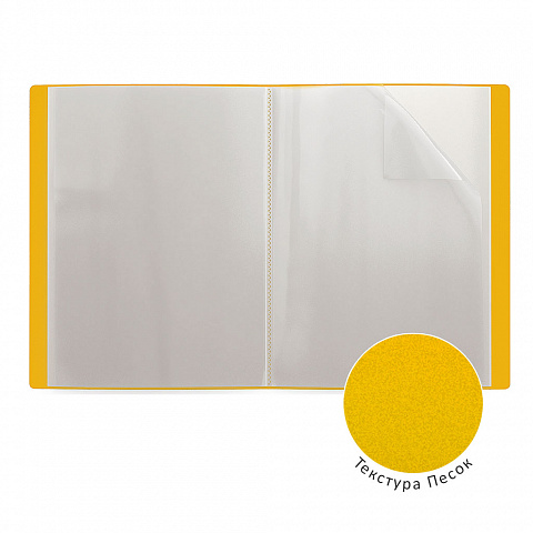 Папка файловая формата А4 из высококачественного пластика с текстурой поверхности "песок", на которой не видно отпечатков пальцев и мелких царапин. Предназначена для хранения и просмотра документов. Папка содержит 40 прозрачных листов-карманов, надежно скрепленных сваркой. Карман на корешке папки предназначен для информационной карточки. Цвет папки – желтый. Папка вмещает до 100 бумажных листов. Размер - 238x310х24мм, толщина - 0.6мм. |