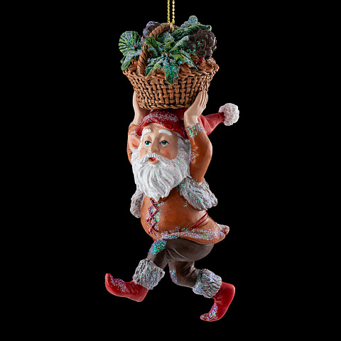 Волшебный лесной гном несет корзину с еловыми ветками и шишками. Очаровательный персонаж выполнен очень аккуратно, детали тщательно прорисованы. Изделие является относительно тяжелым, предпочтительно использование на искусственной елке. Групповая упаковка… |