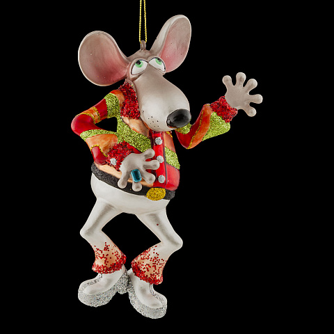 Веселые персонажи оригинально смотрятся на елке. Мышь, застывший в танцевальном движении, отличается ярким костюмом в стиле диско и крупным перстнем на пальце. Украшение выполнено из стекла высокого качества. Изделие достаточно тяжелое и больше подходит для… |