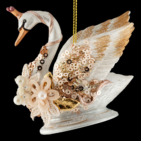 Лебедь выполнен из полирезины и отличается тонко прорисованными деталями. Спина, крылья и грудь декорирована прозрачными золотыми и жемчужными бусинами, что придает эксклюзивности украшению. Украшение достаточно тяжелое и больше подходит для искусственных елок. Групповая упаковка предназначена только для безопасной транспортировки и хранения. |