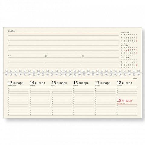 Обложка из высококачественного итальянского матового материала с оригинальной фактурой, с поролоном, по периметру отделочная строчка в цвет материала. Возможно нанесение логотипа на обложку любым способом тиснения. Двойная евроспираль серебряного цвета. Блок: 112 страниц, тонированная бумага 70 г/кв.м, печать в 2 краски. Дополнитальные разделы: личные данные, календарь на 2 года, дни рождения, праздничные дни, полезные сервисы, месячный планинг. |