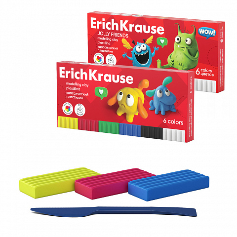 Пластилин классический ErichKrause Jolly Friends 6 цветов со стеком, 108 г (в коробке 6 шт)