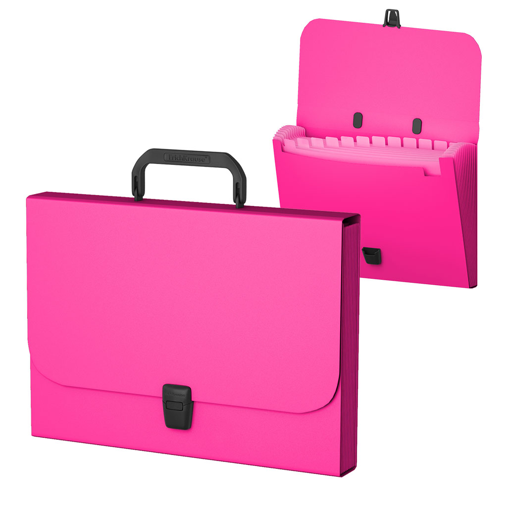 Портфель пластиковый ErichKrause® Neon, с 12 отделениями, A4, розовый (в пакете по 1шт.)