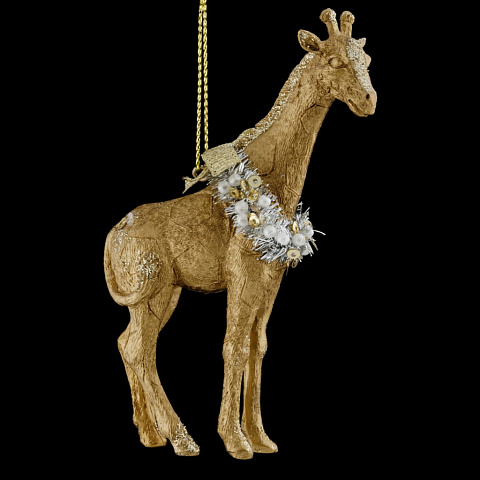Жираф выполнен в золотом цвете и отличается рельефной текстурой. Шея декорирована серебряным венком, дополненным жемчужными бусинами, пайетками и золотым бантом. Миниатюрность и легкость изделия позволяет украшать натуральные и искусственные елки. Групповая… |