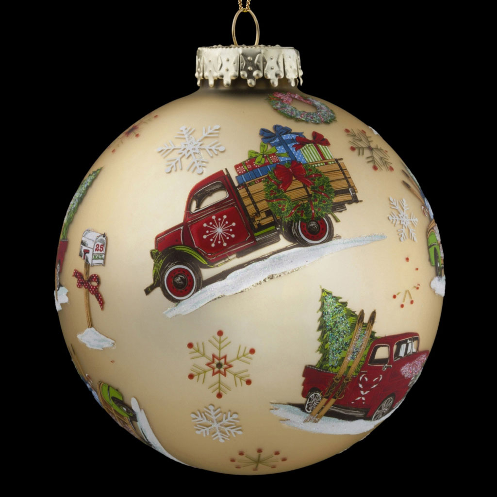 Матовый золотой шар украшен изображениями грузовиков, везущих елки, лыжи и подарки. Изделие выполнено из стекла высокого качества и частично декорировано блестками. Групповая упаковка предназначена только для безопасной транспортировки и хранения. |