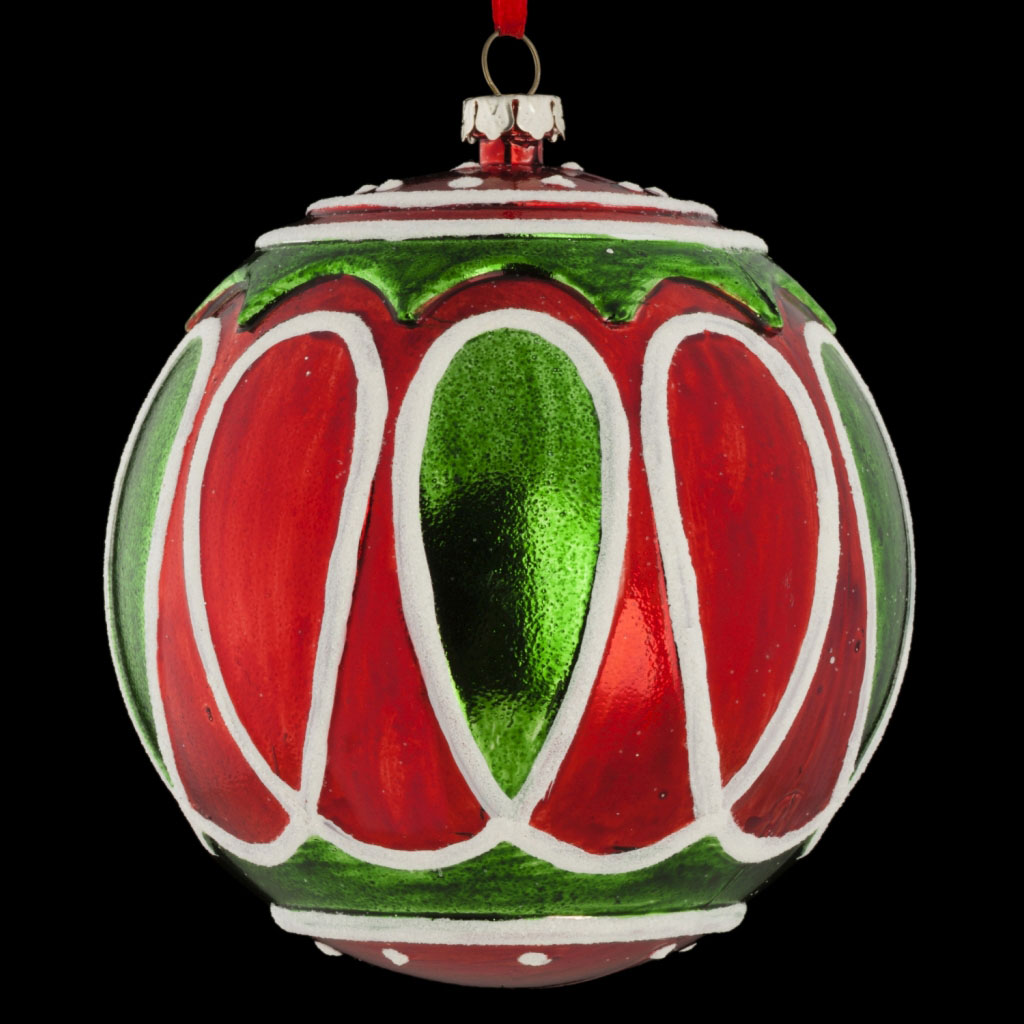 Крупный елочный шар выполнен из легкого пластика. Украшение отличается интересными деталями и яркими глянцевыми красным и зеленым цветом.Упаковка - полибэг. |