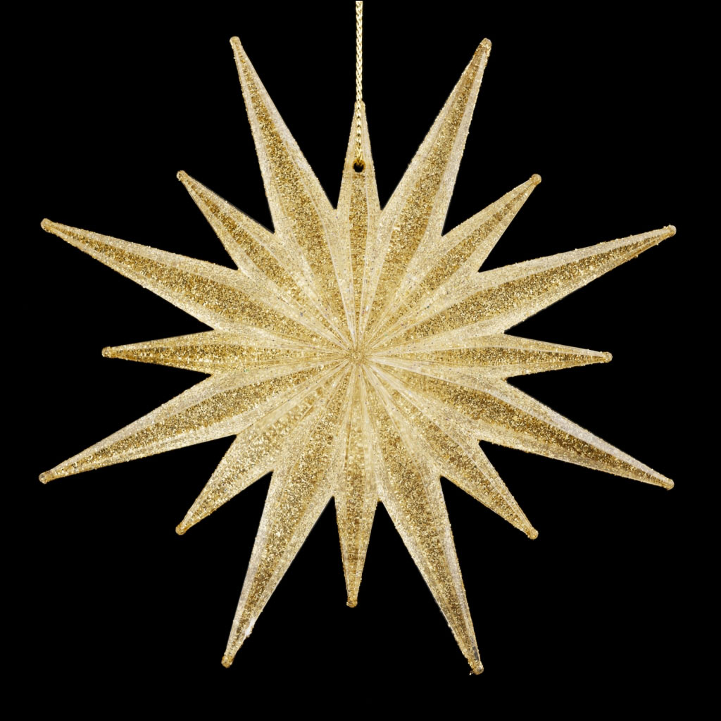 Украшение в виде многоконечной звезды отличается двусторонним покрытием: с одной стороны оно полностью покрыто золотыми блестками, а с другой - прозрачный глянец позволяет любоваться блеском золота, как будто запечатанным внутри звезды. Упаковка - полибэг. |