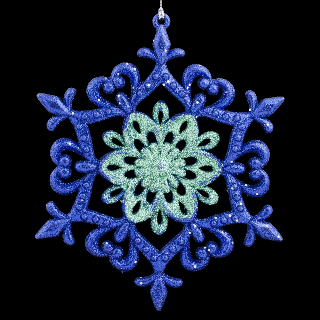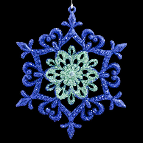 Тонка узорная снежинка выполнена в глубоком синем цвете, а ее сердцевина подчеркнута бирюзовыми блестками. Упаковка - полибэг. |