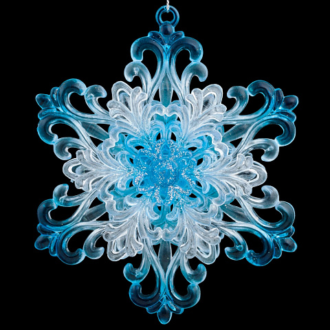 Узорная объемная снежинка отличается необычной техникой, сочетающей матовое и глянцевое покрытие, и плавный переход цвета от прозрачного к кристально-голубому. Центр украшения изящно присыпан серебряными блестками. Упаковка - полибэг. |