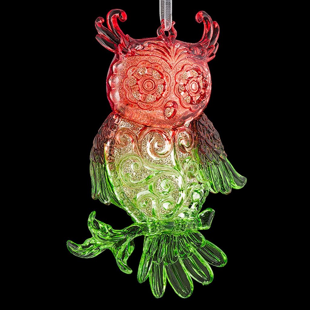 Филин выполнен из прозрачного пластика, цвет изделия плавно переходит от красного к зеленому. Внешняя оболочка отличается резным рельефом, а внутренняя часть украшения полностью покрыта золотыми блестками, что создает эффект дополнительного объема. Упаковка - полибэг. |