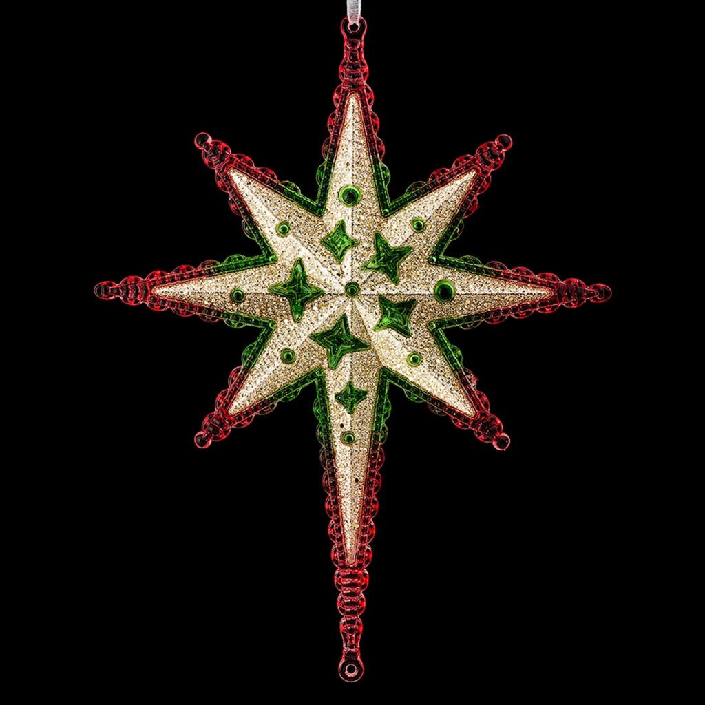 Яркое украшение в виде восьмиконечной звезды отличается сверкающей платиновой сердцевиной с прозрачными зелеными прожилками и красными краями. Упаковка - полибэг. |