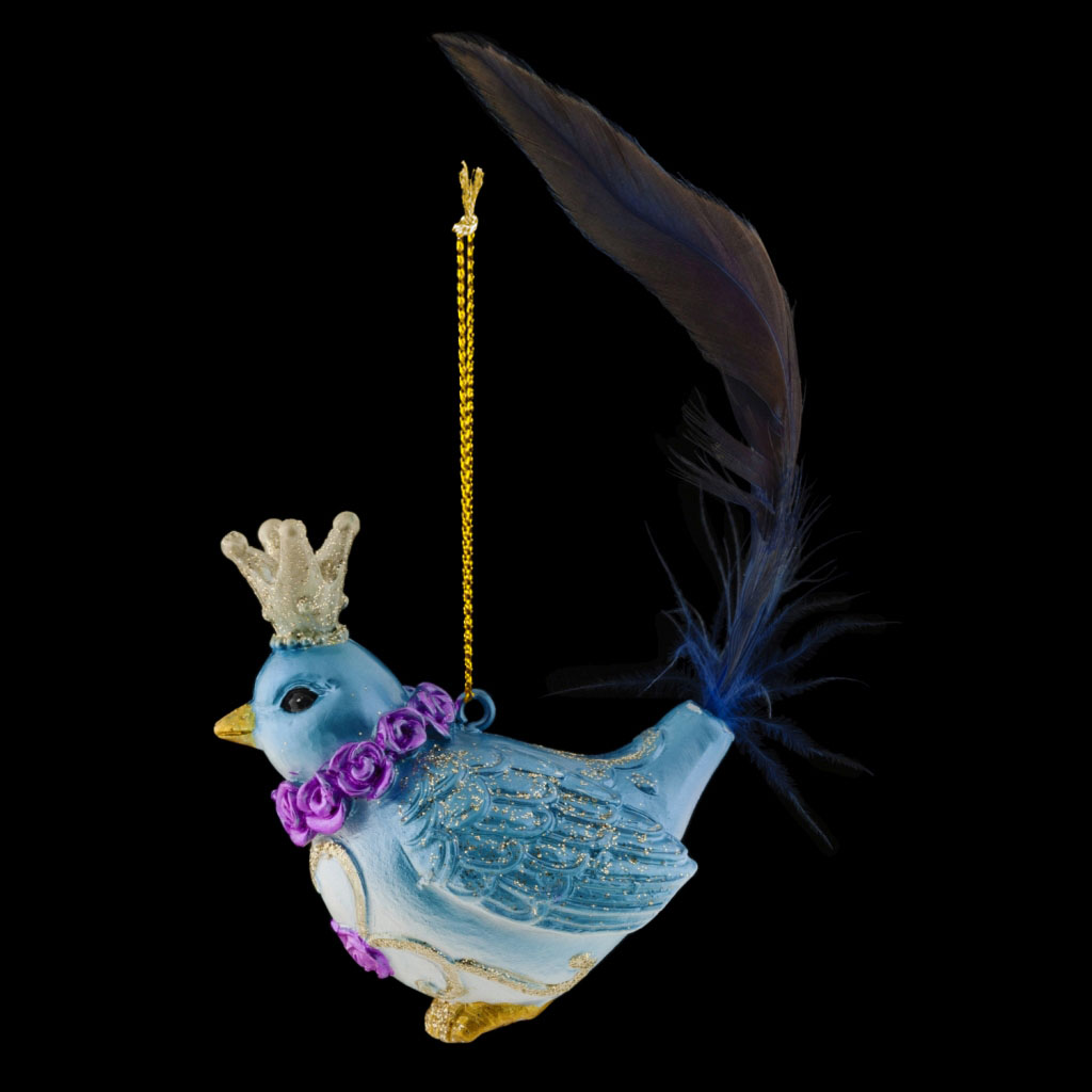 Птица в короне выполнена в насыщенном голубом оттенке и декорирована длинным синим пером. Украшение подходит для елок небольшого размера. Групповая упаковка предназначена только для безопасной транспортировки и хранения. |