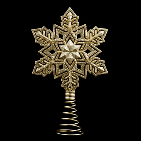 Верхушка подойдет для елок среднего размера. Снежинка выполнена из пластика и имеет металлическую пружину, позволяющую прикрепить верхушку максимально аккуратно и надежно. Изделие полностью покрыто золотой краской. Упаковка - полибэг. |