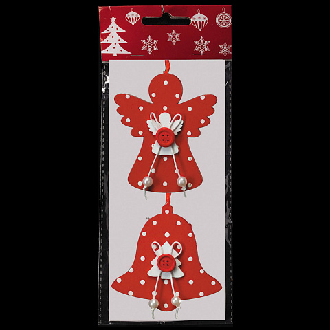 Набор состоит из двух украшений - ангела и колокольчика, выполненных из древесины и декорированных аккуратным бантиком. Упаковка: пакет с хедером из плотного картона и европодвесом. |