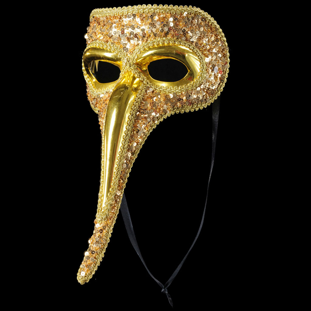 Изумительная маска в размер лица взрослого человека. Очень корошая, качественная форма сделана из пластика. Блеск золота благородно оттеняют пайетки, плотно рассыпанные по замыслу дизайнера. Деликатность подчеркивает окантовка из золотой тесьмы в форме вензелей. Упаковка - полибэг. |