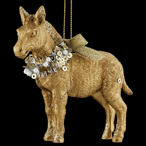 Ослик выполнен в золотом цвете и отличается рельефной текстурой. Шея декорирована серебряным венком, дополненным жемчужными бусинами, пайетками и золотым бантом. Миниатюрность и легкость изделия позволяет украшать натуральные и искусственные елки… |