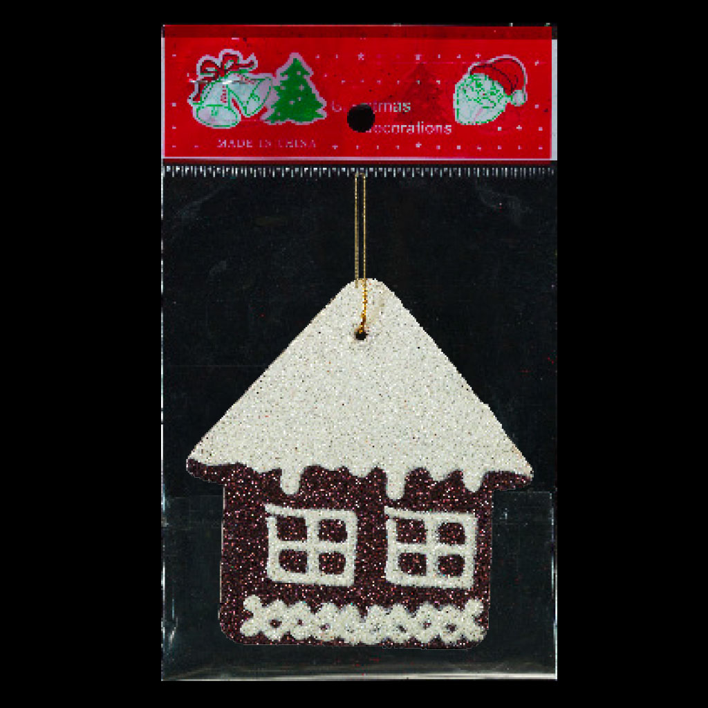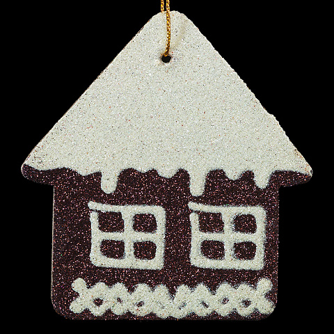 Плоское украшение в виде домика выполнено из пресованного картона и покрыто сверкающими блестками.