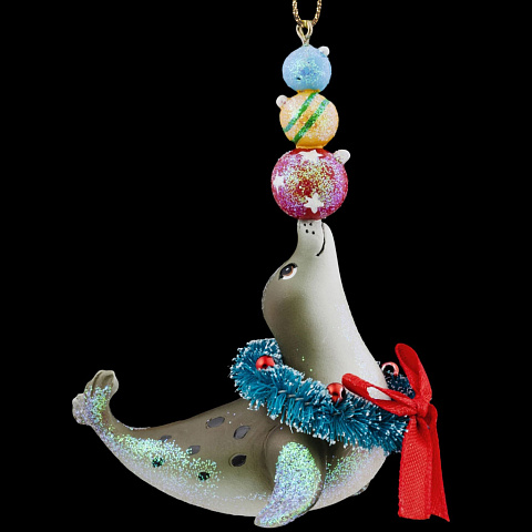 Морской котик, держащий на носу мячи, отличается точно прорисованными деталями. Миниатюрность и легкость изделия позволяет украшать натуральные и искусственные елки. Украшение частично покрыто блестками, мерцающими в темноте загадочным зеленым светом. Групповая… |