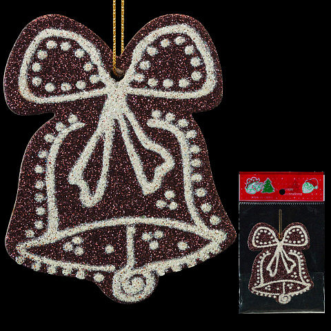 Плоское украшение в виде колокольчика выполнено из пресованного картона и покрыто сверкающими блестками. Упаковка: пакет с хедером из плотного картона и европодвесом. |