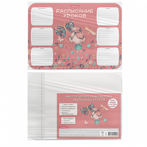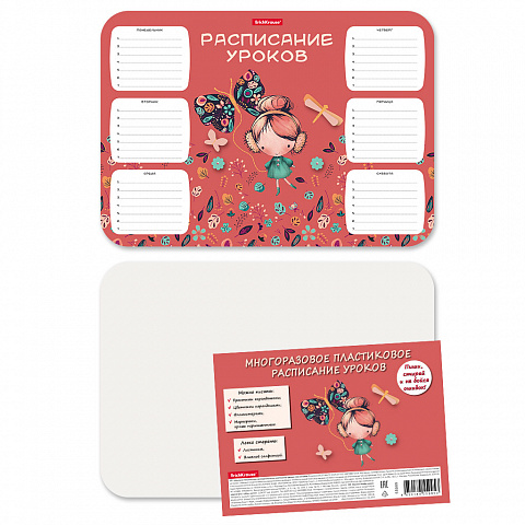 Расписание уроков формата А4 (210х297 мм) из высококачественного пластика. Поверхность подходит для многократного написания простыми и цветными карандашами, фломастерами, любыми не перманентными маркерами. Толщина пластика — 0.4 мм. Шестидневная учебная неделя, каждый день содержит строки для записи. Упаковка — индивидуальный пакет. |