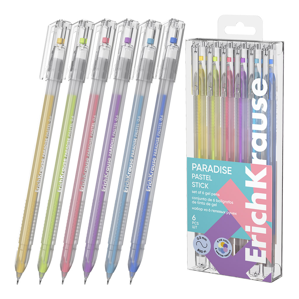 Набор из 6 ручек гелевых ErichKrause Paradise Stick Pastel 0.6, цвет чернил ассорти (в пэт-боксе) |