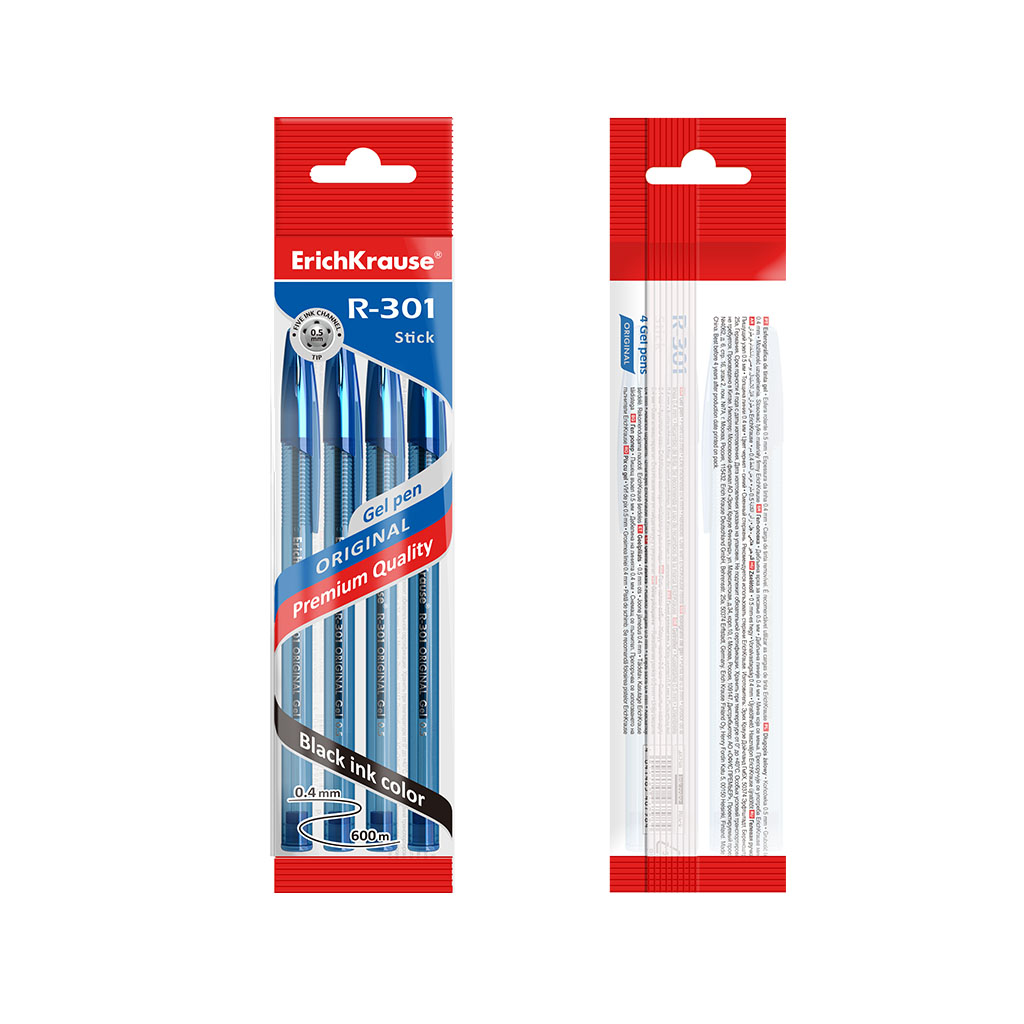 Ручка гелевая ErichKrause R-301 Original Gel Stick 0.5, цвет чернил синий (в пакете по 4 шт.)