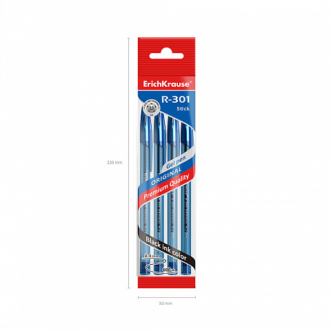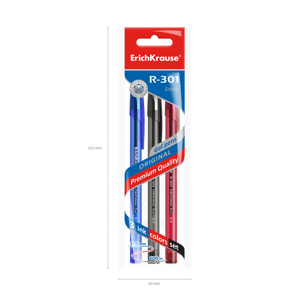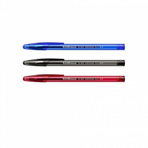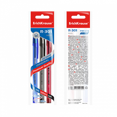 Набор из 3 ручек гелевых ErichKrause R-301 Gel Stick Original 0.5, цвет чернил: синий, черный, красный (в пакете)