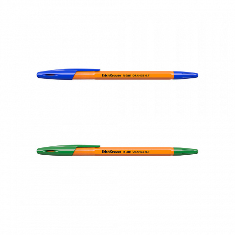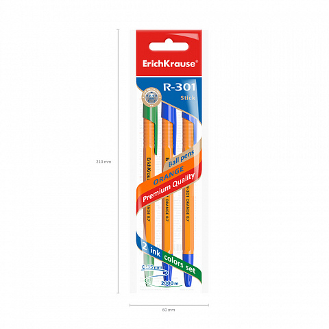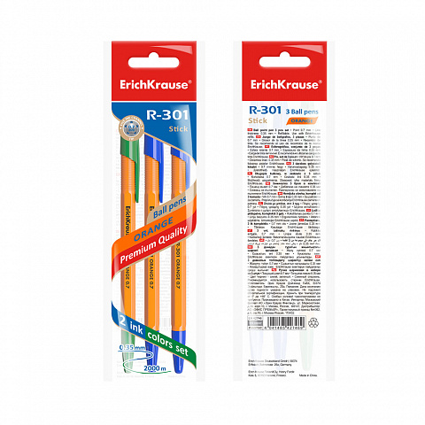 Ручка шариковая ErichKrause® R-301 Orange Stick 0.7, цвет чернил: синий, синий, зеленый (в пакете по 3 шт.) |