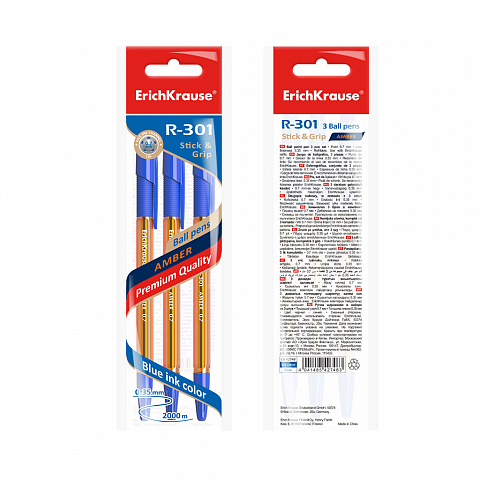 Набор из 3 ручек шариковых ErichKrause R-301 Stick&Grip Amber 0.7, цвет чернил синий (в пакете)