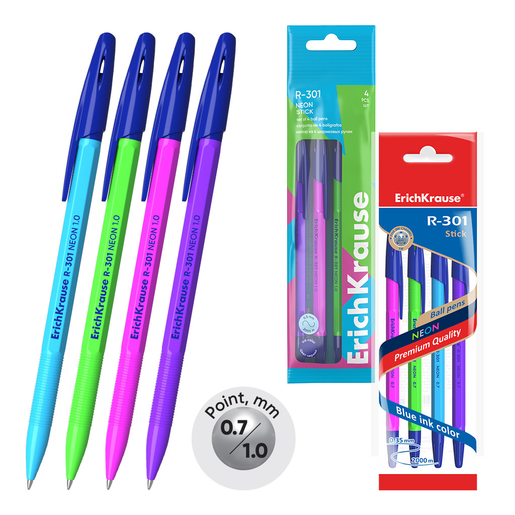 Набор из 4 ручек шариковых ErichKrause R-301 Stick Neon 1.0, цвет чернил синий (в пакете)
