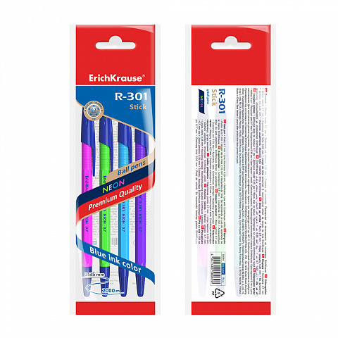 Набор из 4 ручек шариковых ErichKrause R-301 Stick Neon 1.0, цвет чернил синий (в пакете) |