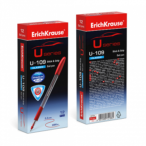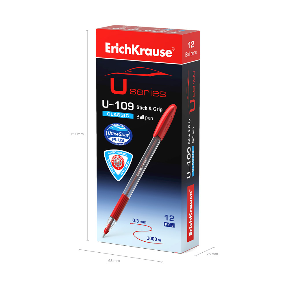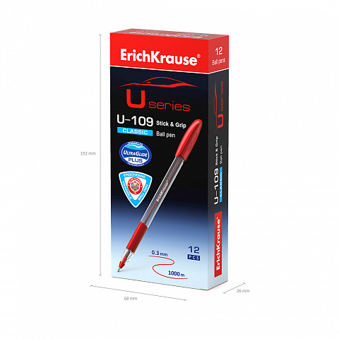 Ручка шариковая ErichKrause U-109 Stick&Grip Classic 1.0, Ultra Glide Technology, цвет чернил красный (в коробке по 12 шт.) |
