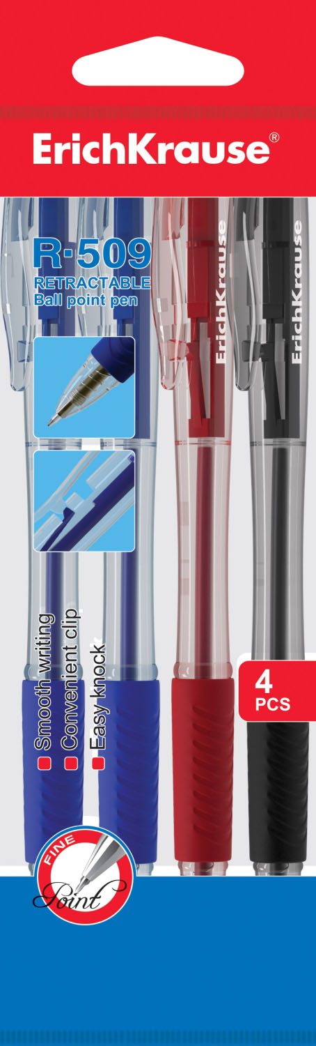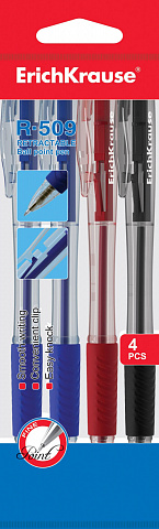 Ручка шариковая автоматическая ErichKrause® R-509, цвет чернил: синий, красный, черный (в пакете по 4 шт.)
