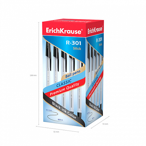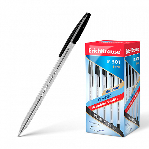 Ручка шариковая ErichKrause R-301 Stick Classic 1.0, цвет чернил черный (в коробке по 50 шт.) |