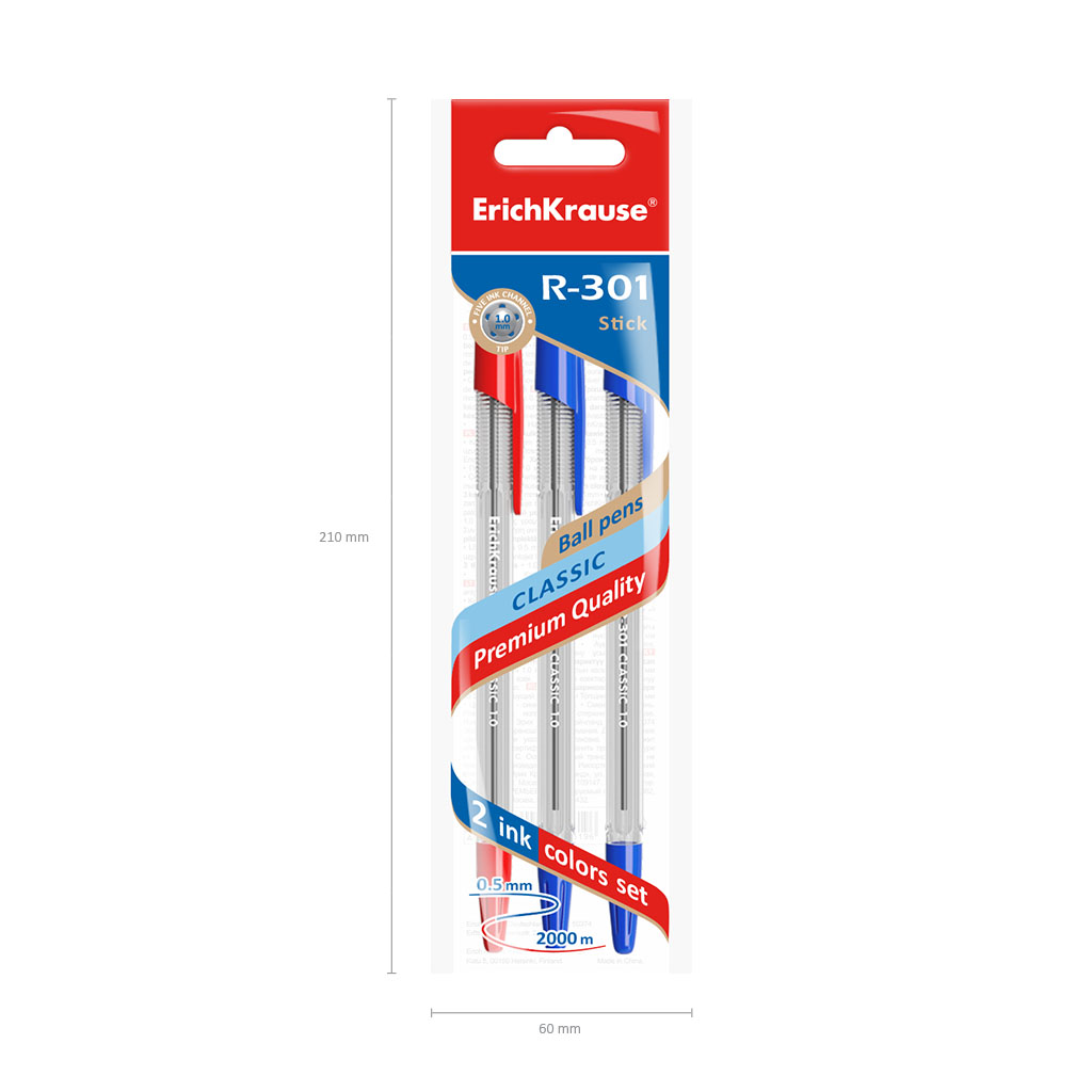 Ручка шариковая ErichKrause® R-301 Classic Stick 1.0, цвет чернил: синий, синий, красный (в пакете по 3 шт.) |