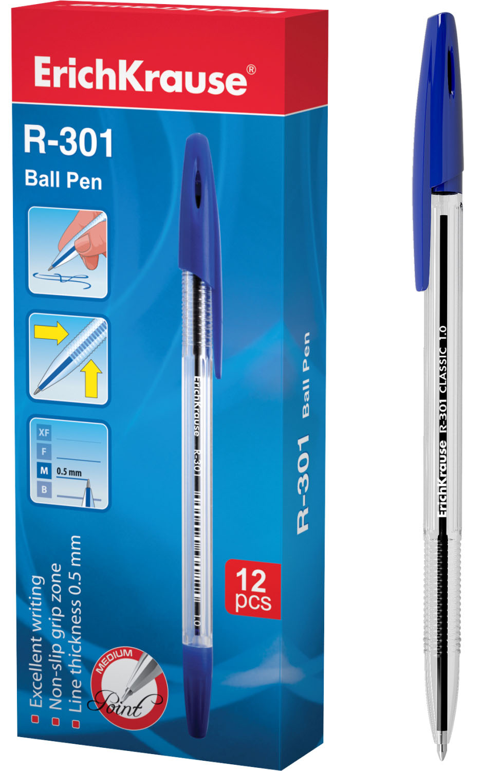 Ручка шариковая ErichKrause® R-301 Classic Stick 1.0, цвет чернил синий (в коробке по 12 шт.) |