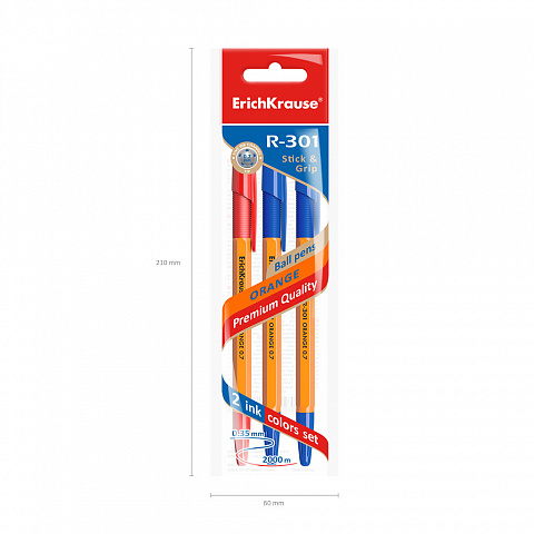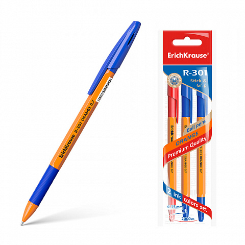 Ручка шариковая ErichKrause® R-301 Orange Stick&Grip 0.7, цвет чернил: синий, синий, красный (в пакете по 3 шт.) |
