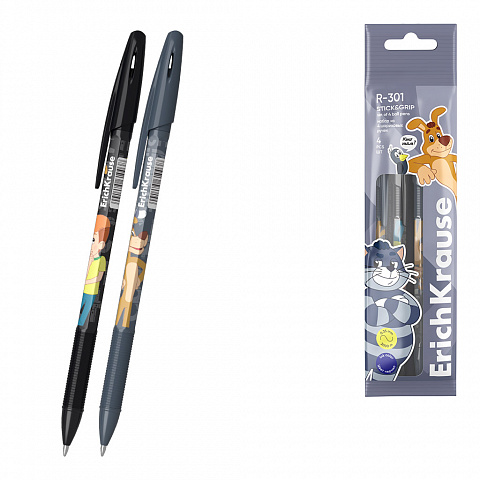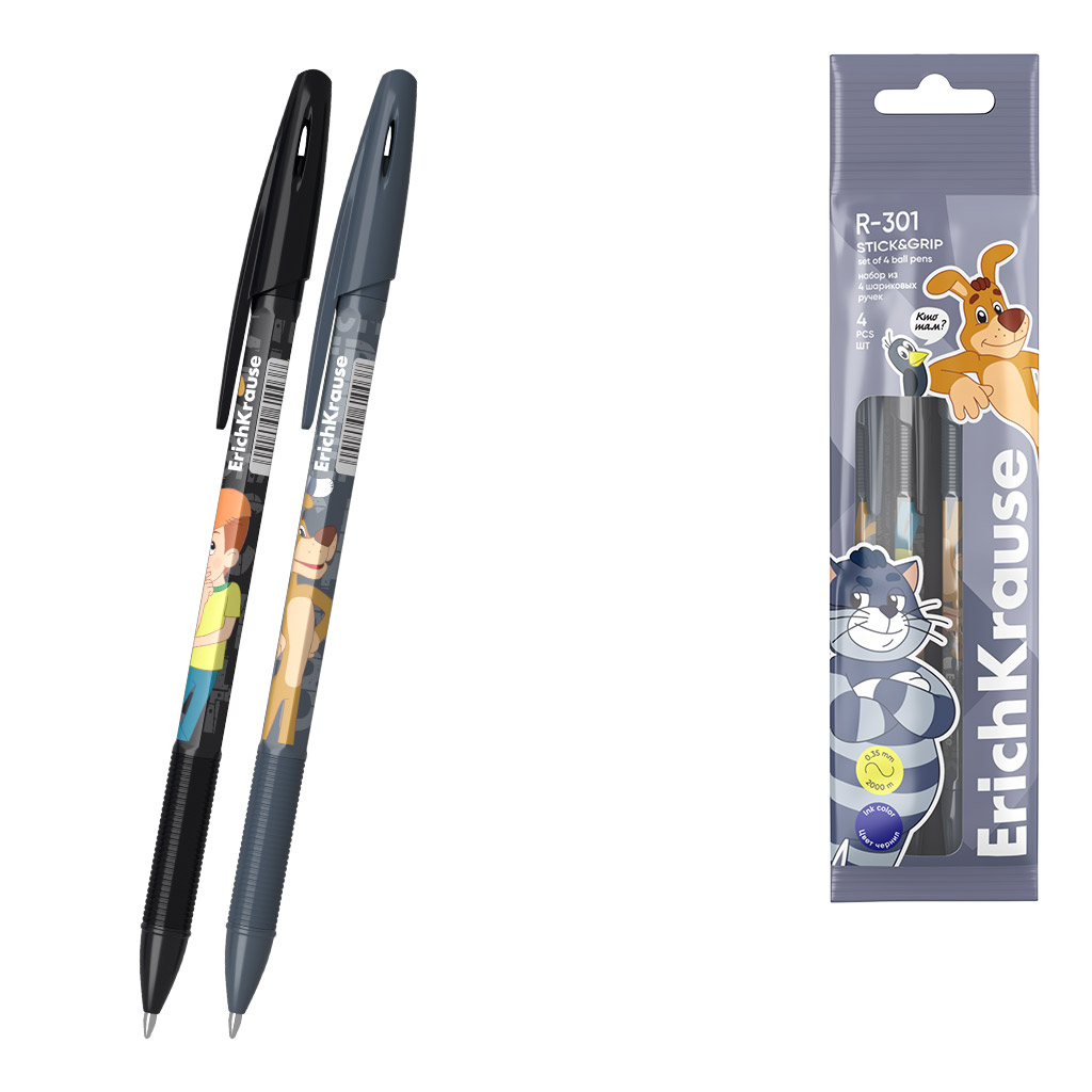 Набор из 4 ручек шариковых ErichKrause R-301 Stick&Grip Простоквашино 0.7, цвет чернил синий (в пакете)