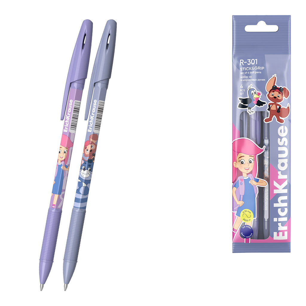 Набор из 4 ручек шариковых ErichKrause R-301 Stick&Grip Простоквашино для девочки 0.7, цвет чернил синий (в пакете) |