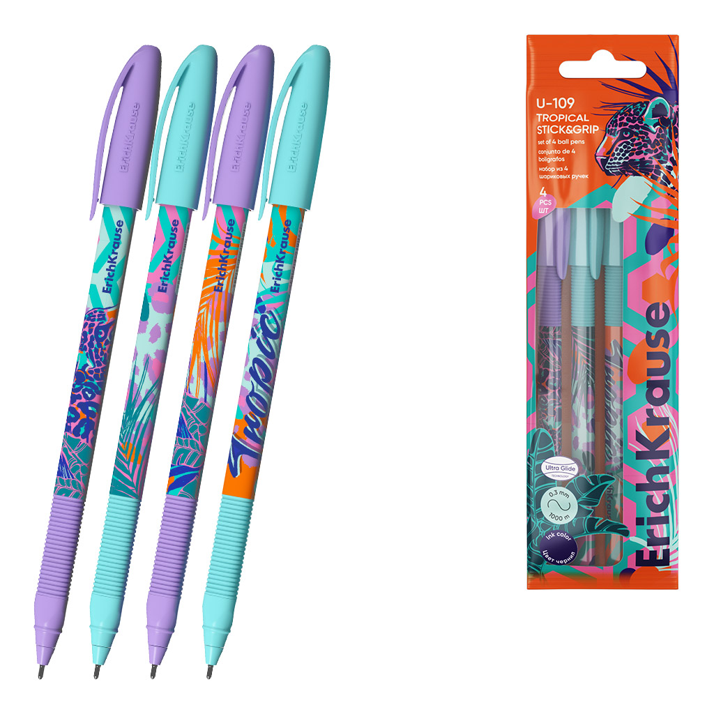 Набор из 4 ручек шариковых ErichKrause U-109 Stick&Grip Tropical 1.0, Ultra Glide Technology, цвет чернил синий (в пакете) |