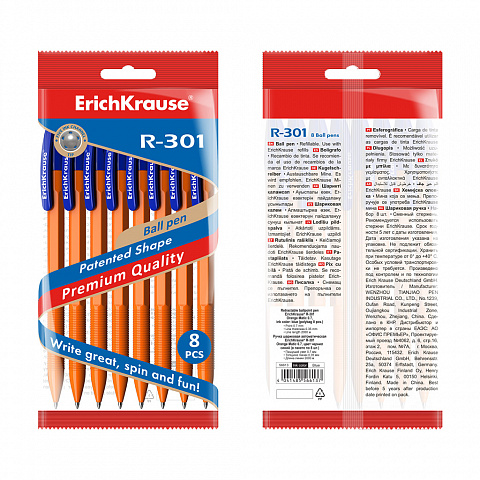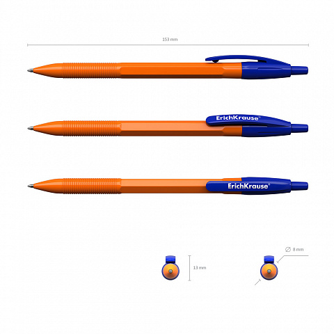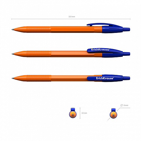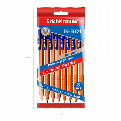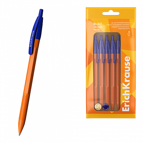 Набор из 8 ручек шариковых автоматических ErichKrause R-301 Matic Orange 0.7, цвет чернил синий (в пакете) |